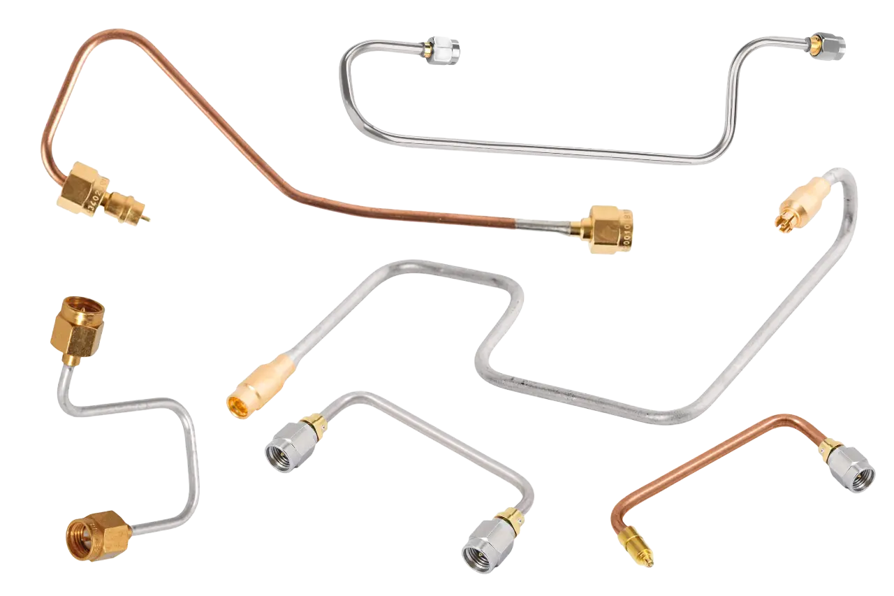High-density RF enclosures requiring bend-to-fit precisionConductRF’s Semi-rigid RF Cable Assemblies offer the highest level of electrical performance and EMI shielding available in an RF coaxial interconnect. These mechanically formed solutions are engineered for applications where low loss (signal attenuation) and phase stability are non-negotiable. They’re built with solid copper or copper-clad stainless steel outer conductors that are machine shaped to your exact physical spacing requirement. The result is the most stable interconnect you can achieve. Ideal for microwave modules, test systems, aerospace instrumentation, and military systems, semi-rigid assemblies provide unmatched signal integrity with zero flex movement.